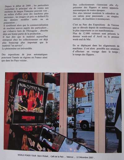 Titre: Pinballs - le temps des flippers Auteurs: Jean-Pierre Cuvier Année: 2008 Editeur: M. Cuvier 176 pages Un grand monsieur du monde des flippers, qui simple collectionneurs et sans les moyens de certains anciens exploitants, à réussi à amasser une documentation et une collection de flipper mécanique impressionnantes. Il a souvent été le sujet principal de nombreux articles sur sa passion dans de nombreux magazines. Ce livre est la concrétisation d\'un rêve, celui d\'écrire un livre sur les flippers mécaniques. Il a édité lui-même ce livre avec un ami imprimeur. Le résultat est splendide, les photos nombreuses. Le format choisie est grand, le papier glacé du plus belle effet. Ce livre est malheureusement introuvable jusqu\'à la prochaine édition. Cette première édition a été vendu par souscription, à une centaine de passionné par l\'intermédiaire d\'un forum internet sur les flippers: flippers-jukeboxes. Le résultat est je l\'avoue, un peu en deçà des espoirs que j\'avais mis dans ce projet. Le coté faible du livre est le rédactionnel que je trouve assez peu structuré. Mais le véritable défaut que je regrette, c\'est le manque d\'informations inédites, et particulièrement à propos du monde franco-français du flipper. Il manque aussi un index, ainsi que la provenance de certaines photos, souvent passionnantes et impressionnantes. Pour un livre réalisé seul, le résultat est magnifique. Il est unique dans son genre, écrit par la personne la plus respectée dans le monde des collectionneurs de flipper, en France et ailleurs. Nous attendons avec impatience la suite de cet ouvrage. |